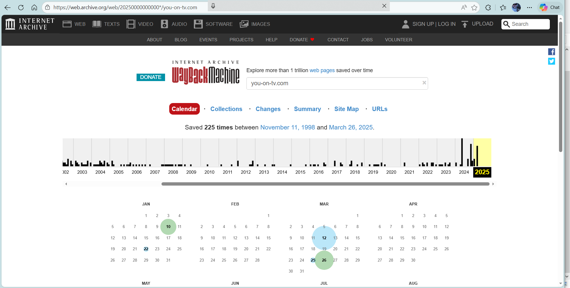 Screenshot from the Internet Archive showing independent captures of You-On-Tv.com dating back to 1998*. -