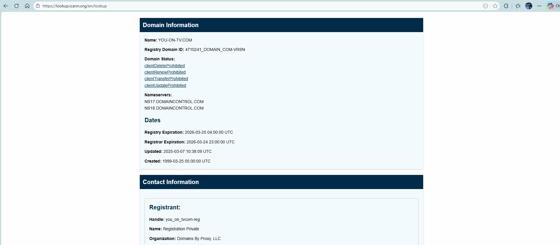 ICANN/WHOIS lookup confirming the official domain registration date of You-On-Tv.com as March 25, 1999*. -